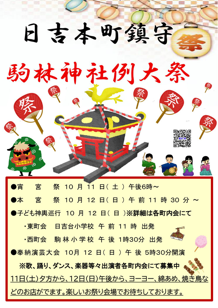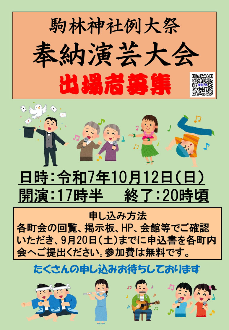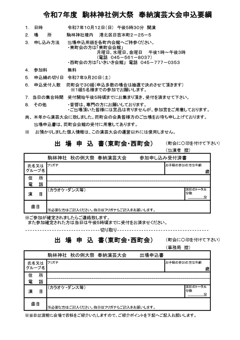 2025/08/27 駒林神社例大祭2025 駒林神社例大祭2025 今年も駒林神社例大祭が行われます。ご家族で参拝にお越しください。今年は例年の奉納カラオケ大会に代わり、奉納演芸大会を開催いたします。参加者も募集していますので奮っての応募お待ちしております。夜店、お囃子、演芸大会などありますので皆様で是非お楽しみください。 令和7年駒林神社演芸大会申込書 参加ご希望の方はご記入いただき東町会会館へご持参ください。用紙は会館にもご用意しております。 令和7年駒林神社演芸大会申込書20250809 .pdf PDFファイル 89.1 KB ダウンロード tagPlaceholderカテゴリ: 駒林神社例大祭, 子ども神輿, 宵宮祭, 本宮祭, 演芸大会