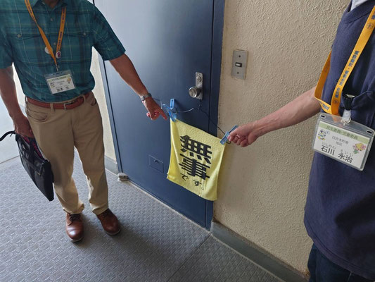 令和7年9月1日(月)防災の日に要援護者安否確認訓練を行いました。これは区役所で災害時に安否確認の登録をしている方を対象にしています。災害時に玄関前などに町会で事前に配った黄色い「無事です」タオルをかけてもらい、外から無事を確認します。でていない援護者には声をかけて安否を確認するというものです。訓練では事前に民生委員が訓練内容をお伝えし、安否確認用の黄色いタオルの準備をお願いしました。当日は民生委員とブロック長が一緒に援護者の家をまわり、確認していきました。今回は49名の支援者をまわり、44枚の黄色いタオルを確認することができました。毎年行うことで、対象者の方もスムーズに準備をしてくださっていると感じます。おひとり暮らしで心配な方など、民生委員を通して区役所に登録できますので相談してください。