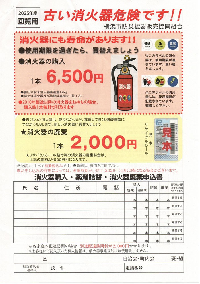 ★日吉台防災拠点訓練の際に消火器の業者が来て、「購入・詰め替え・廃棄」の手続きができます。以下をお読みになり、この機会をご利用ください。