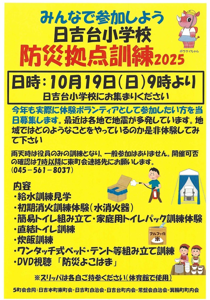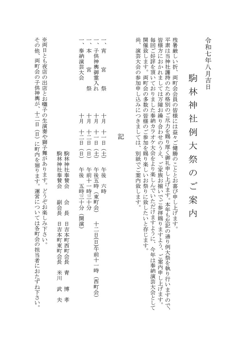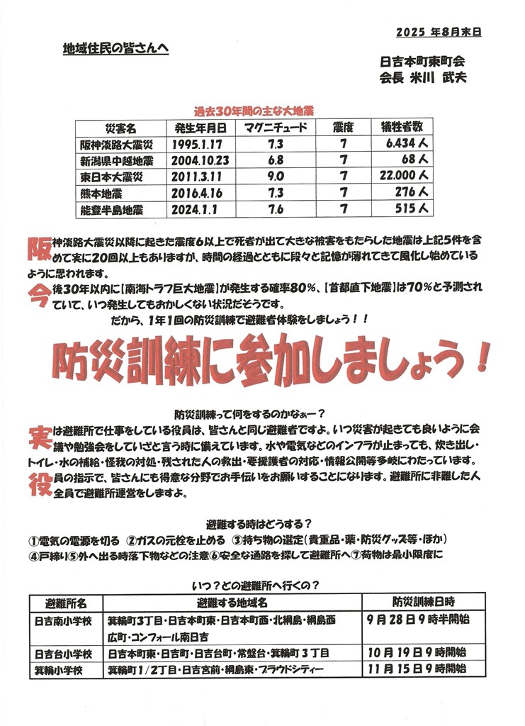 9月は日吉南小学校の防災拠点訓練があります。学区の方はそちらに避難することになりますので、どんなことをしているのか確認してみてください。10月の駒林神社例大祭のお知らせも載せました。お楽しみいただければと思います。